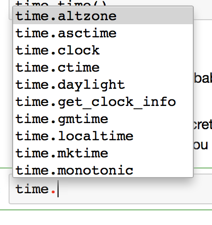 That is one of the hidden secrets of jupyter notebooks. Let me introduce you to the tab key. Start by typing "time." then hit the tab key and you will be given all of the options available for you that is ready to be used since you imported the package time.